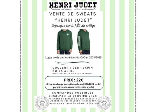 Par AURELIA HEMERY, publié le vendredi 28 novembre 2025 19:19 - Mis à jour le vendredi 28 novembre 2025 19:19Comme l'année dernière nous vous proposons une vente de sweats "HENRI JUDET" couleur vert sapin à 22€ l'unité. Des bons de commandes ont été distribués à chaque élève. Commandes possibles jusqu'au 16 janvier 2026. -