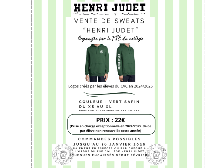 Comme l'année dernière nous vous proposons une vente de sweats "HENRI JUDET" couleur vert sapin à 22€ l'unité. Des bons de commandes ont été distribués à chaque élève. Commandes possibles jusqu'au 16 janvier 2026.