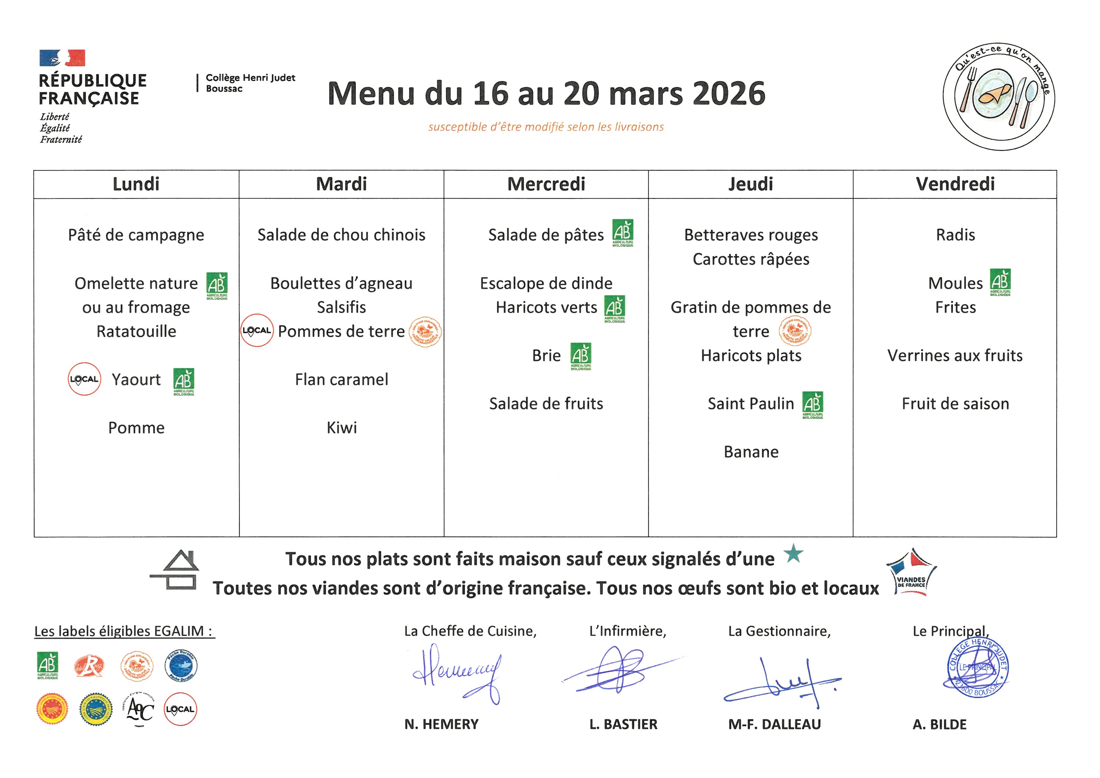 Menus du 16 au 20 mars